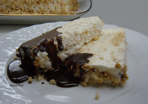 Alufolie entfernen, Eis aus der Kastenform stürzen und auf eine Servierplatte setzen, und mit den zurückgestellten gehackten Mandelstücken das Eis überziehen. Je 2 Scheiben auf einen Teller anrichten und mit heißer Schokoladensauce servieren. |