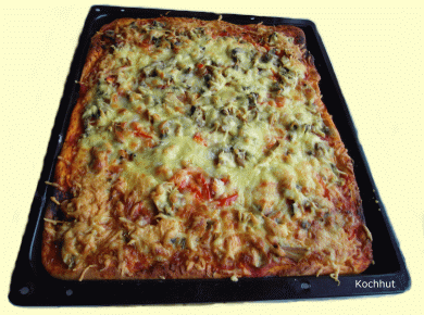 Aus Mehl, Hefe, Öl, Milch, Salz und Zucker einen Teig herstellen. An einem warmen Ort 45 Minuten gehen lassen. Das Backofenblech mit Olivenöl bestreichen und den ausgerollten Teig darauflegen. Mit Tomatensoße bestreichen und den restlichen Zutaten belegen. Bei 200°C ca. 20 Minuten backen.