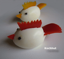 Für den Schwanz, Kamm und den Schnabel brauchen Sie eine rote, grüne oder gelbe Paprikaschote. Für die Augen ein paar schwarze Oliven.