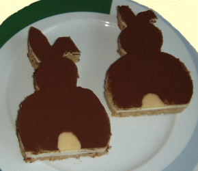 | Zubereitung: Eier trennen, Eiweiß steif schlagen, dabei 150 g Zucker einrieseln lassen. Eigelb einzeln darunterschlagen. Mehl, Cappuccinopulver und Backpulver daraufsieben und unterheben. Die Masse gleichmäßig auf das ausgelegte Backblech streichen. Im vorgeheizten Backofen bei 175° C im E-Herd, Gas 2 Stufe ca.15 Minuten backen. Den Biskuitboden aus dem Blech holen. Papier sofort abziehen und auskühlen lassen. Gelatine mit 3 EL kaltem Wasser auflösen. Mascarpone, Speisequark und 100 g Zucker verrühren. Gelatine auf dem Ofen auflösen, mit 2 EL Creme verrühren und unter die übrige Creme rühren. Auf den Biskuitboden streichen und ca. 90 Minuten kalt stellen. Marzipan mit Puderzucker gut verkneten, ausrollen und auf der Creme anpassen. Hasenschnittmuster ausdrucken, ausschneiden, darauf legen und das Hasenmuster mit einem Messer herausschneiden. Beim bestäuben mit Kakao das Schwänzchen mit dem Daumen abdecken. |