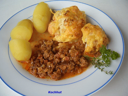 Zubereitung:Blumenkohl waschen, in Salzwasser ca. 15 Min. vorgaren. Zwiebeln in Spalten schneiden. Hack in heißem Öl krümelig braten. Zwiebeln und getrocknete Kräuter zugeben, anbraten. Tomatenmark und Brühe zugießen, 5 Min. köcheln lassen. Mit Salz, Pfeffer und Paprika abschmecken. Blumenkohl abgießen, abtropfen lassen. Käse raspeln. Sauce in eine flache Auflaufform geben. Blumenkohl in die Sauce setzen und mit Käse bestreuen. Butterflöckchen auf den Käse geben. Alles im vorgeheizten Ofen E Herd 200° 30-35 Minuten überbacken. Inzwischen Kartoffeln waschen und in reichlich Salzwasser ca. 20 Min. kochen. Alles zusammen servieren. | |