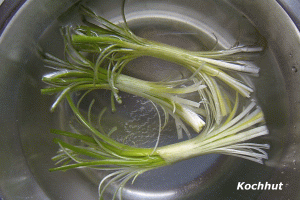 Frühlingszwiebeln mit großen Knollen waschen und die Schalen entfernen. Run um V-förmige Einschnitte bis zur Mitte einschneiden.