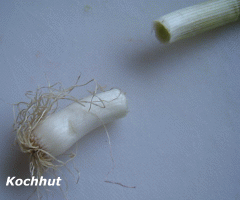 Frühlingszwiebeln auf Küchenbrett legen. Mit einem Schälmesser die Wurzel abschneiden. Zwiebel quer in 10 cm langen Stücke schneiden, das zu jeweils 5 cm weißer Zwiebel und grünem Stamm besteht. Die Zwiebel längs vom weißem Ende aus fast zur Mitte des Stückes einschneiden. Das ganze mehrmals wiederholen, bis das gesamte Ende in feine Splitter geschnitten ist.
