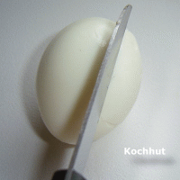 2 Hartgekochte Eier im Eierschneider schneiden.
