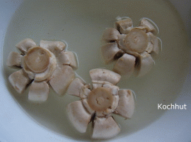 Die Pilze in Zitronenwasser tauchen, um ein Braunwerden zu vermeiden. Tip: Kombinieren Sie ein oder zwei gerillte Pilze mit einem Zweig Brunnenkresse zur Garnierung von Braten und anderen Rindfleischgerichten. Verzieren Sie die Enden eines Hühnerkebabs mit gerillten Pilzköpfen. Garnieren Sie Ihre Lieblingspastete mit mehren gerillten Pilzköpfe.