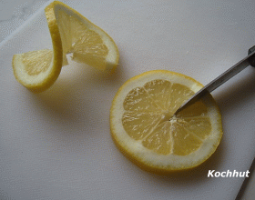 Eine große Zitrone in 5 mm dicke Scheiben schneiden. Jede Scheibe halbieren.