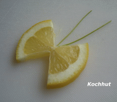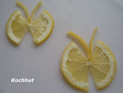 durchtrennen. Die Zitronenscheibe so ausrichten wie Schmetterlingsflügel und mit