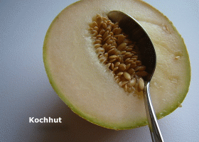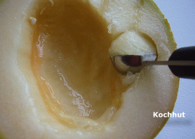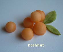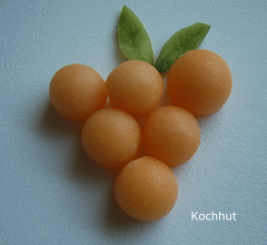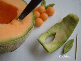 Eine Netzmelone halbieren und die Kerne entfernen. Aus der außen Schale Blätter ausschneiden und mit einem Zahnstocher Blattadern einritzen.