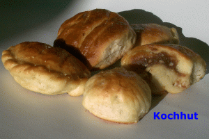 Zubereitung: Margarine erhitzen. Mehl durch ein Sieb schütten (damit es keine Klumpen gibt). Danach in einer Schüssel mit Vanillinzucker und Backpulver vermischen und Salz drüberstreuen. Noch Hefe dazu mischen. In der Mitte von der Mischung ein Loch mit der Hand graben. In einer anderen Schüssel Wasser, die geschmolzene Margarine, Eier und 1 TL Cardamompulver mischen. Dann in die Mitte der Mehlmischung kippen. Gut durchkneten bis der Teig gut formbar ist. (nicht zu hart oder zu weich). Am Ende wird der Teig mit ein bisschen Öl noch mal durchkneten und ein Kreuz geformt. Eine Plastikfolie wird mit Wasser befeuchtet und dann über die Schüssel gespannt. Über die Folie wird noch ein Geschirrtuch gelegt und der Teig eine Stunde in warmer Umgebung gehen gelassen. Füllung 1: Walnüsse zerhacken und mit Zucker und Cardamompulver vermengen. Füllung 2: Kokosnusspulver mit Cardamompulver verrühren und Zucker drüberstreuen. Füllung 3: Datteln entkernen und in einem Topf etwas anbraten und anschließend mit Öl und Cardamompulver vermengen. Den Teig in drei Teile teilen; ausrollen und mit einem Glas ausstechen und dann mit den verschiedenen Mischungen füllen und zu einer Art Maultasche formen. Im Backofen bei 250°C Ober-/Unterhitze goldbraun backen.