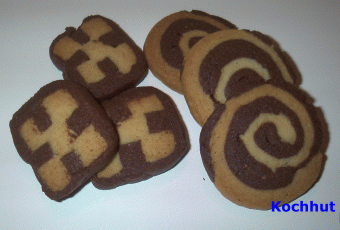 Zubereitung: Mehl in eine Schüssel geben. Ei, Zucker, Vanillinzucker und das weiche Fett daraufgeben, alles mit einem Handrührgerät auf der niedrigen Schaltstufe verkneten. Unter die Hälfte des Teiges Kakao, Zucker und Milch kneten und beide Teige kalt stellen. Für ein Schachbrettmuster den hellen und den dunklen Teig etwa 1 cm dick ausrollen und in Streifen von 1 cm Breite schneiden. Aus dem Teigrest eine dünne Platte in der Länge der Streifen ausrollen und dünn mit Eiweiß oder Milch bestreichen. Helle und dunkle Streifen abwechselnd neben- und übereinander auf die Teigplatte legen. Die Streifen mit Eiweiß oder Milch bestreichen und in die Teigplatte einschlagen. Für ein Schneckenmuster eine helle und eine dunkle Teigplatte in gleicher Größe ausrollen. Die eine Platte mit Eiweiß oder Milch bestreichen, die andere Platte darauflegen und zusammenrollen. Die Teigrollen kalt stellen. Mit einem scharfen Messer etwa 1/2 cm dicke Plätzchen abschneiden, auf ein ungefettetes Backblech geben und im vorgeheizten Backofen ca. 8 Minuten backen. E-Herd 220-225