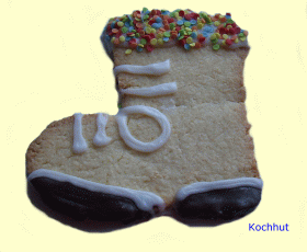 Den Teig auf einer bemehlten Arbeitsfläche etwa 4 mm dick ausrollen und mit der ausgeschnittenen Schablone auf dem Teig den Stiefel ausschneiden. Die Stiefel auf ein mit Backpapier ausgelegtes Backblech im vorgeheizten Backofen bei 200°C ca. 10 bis 15 Minuten backen.