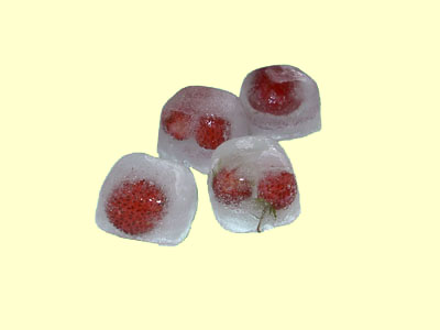 In die Eiswürfel kleine Früchte ( Erdbeeren, Kirschen u.s.w) oder kleine Blüten einfrieren. Die Würfel können auch zur Dekoration von Fischmarinaden, Süßspeisen oder Salate verwandt werden.