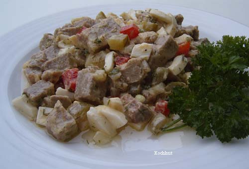 Zubereitung:Rindfleisch, Eier, Zwiebel, Gurken und Paprika in Würfel schneiden. Marinade zubereiten und darüber gießen. Alles gut vermischen und ca 2 Stunden im Kühlschrank durchziehen lassen.