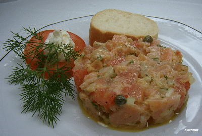 Zubereitung: Die Tomaten mit kochendem Wasser überbrühen. Häuten, halbieren, entkernen, fein würfeln. Schalotten abziehen, fein hacken. Lachsfilet ebenfalls sehr fein hacken. Alles miteinander mischen. Kapern zufügen. Die Lachsmischung mit Dill, Senf, Zitronensaft, Olivenöl, etwas Salz und Pfeffer würzen. Mit Dessert- und Vorspeisen-Ringe (Ø 8 oder 11 cm) in Form bringen. | |