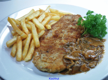 Schnitzel flach klopfen und würzen. Die Pilze, feucht abreiben und in